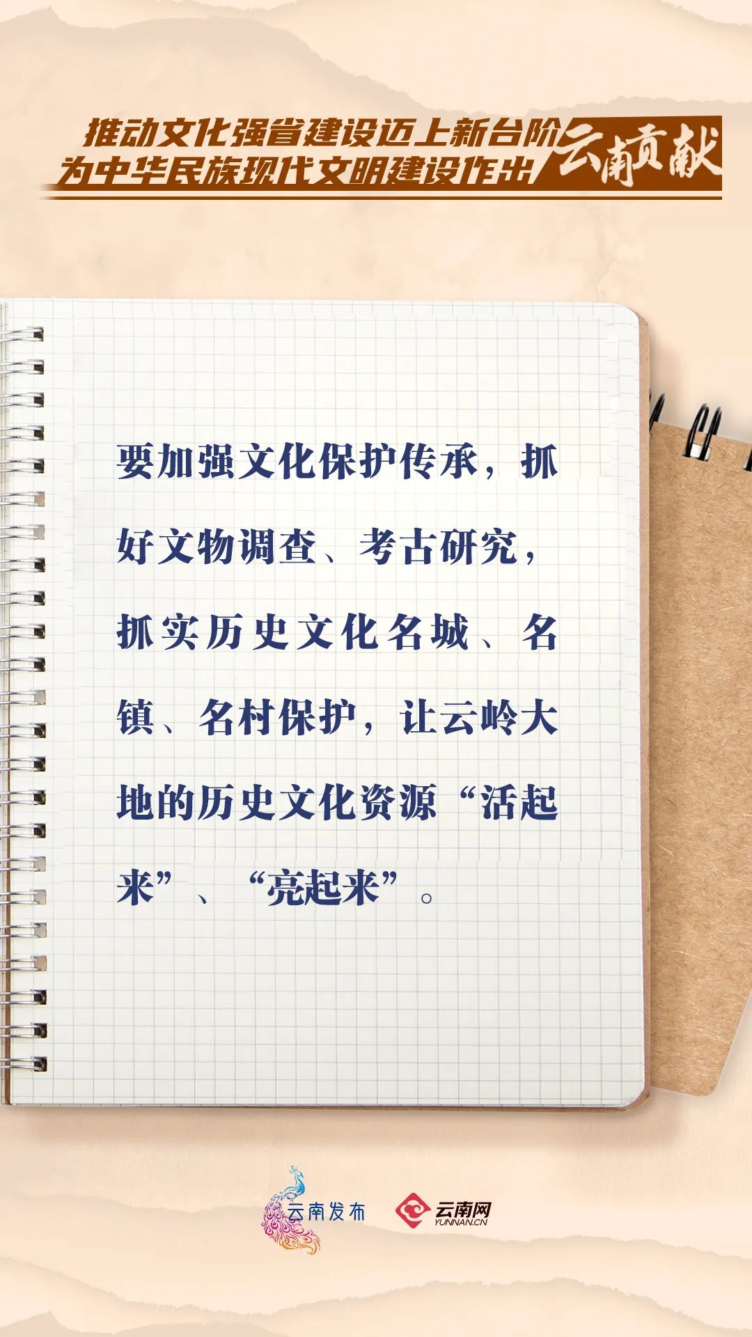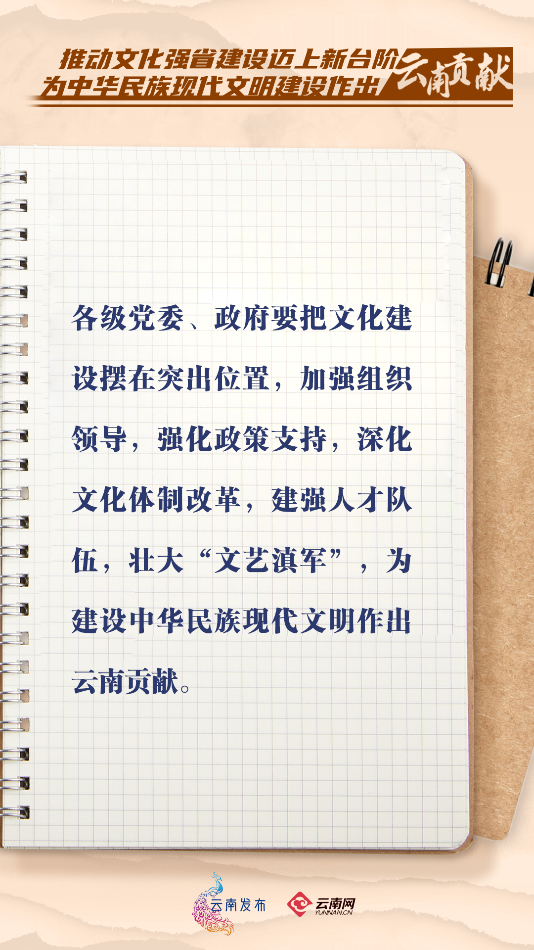 云南文化資源是中華文化的重要瑰寶,文化遺產(chǎn)豐富厚重,民族文化多姿多彩,革命文化資源富集,文旅資源獨(dú)具魅力,民族文化的交流繁榮有力促進(jìn)了民族團(tuán)結(jié)進(jìn)步。要站位服務(wù)建設(shè)中華民族現(xiàn)代文明大局,積極推進(jìn)文化強(qiáng)省建設(shè),為全省現(xiàn)代化建設(shè)提供堅(jiān)強(qiáng)的思想基礎(chǔ)、文化支撐、精神力量。