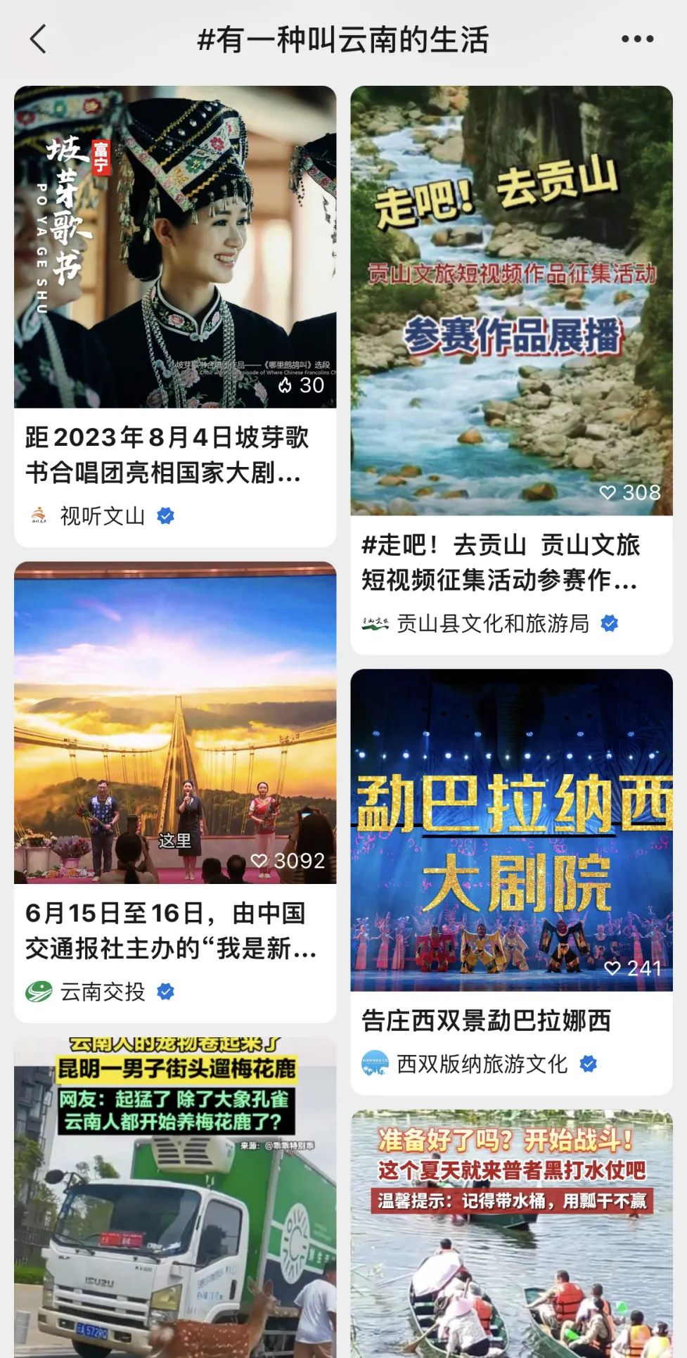 云南州、市、縣各級媒體結(jié)合各地特色對地方風(fēng)光和人文風(fēng)情進(jìn)行宣介,如玉龍雪山、哈尼梯田、瀘沽湖、海菜花、亞洲象、紅嘴鷗等,持續(xù)推介“有一種叫云南的生活”相關(guān)內(nèi)容。