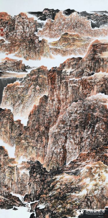 率性揮灑的《甲骨小鳥(niǎo)》、《月寒天上》、《神州國(guó)色》、《瓜鳥(niǎo)圖》、《洗盡芳華》、《棟梁圖》等作品,與乃師吳悅石頗有異曲同工之妙,筆跡流暢、頓挫老道,畫(huà)面簡(jiǎn)潔卻飽滿、頗為別致。杜建民先生還十分注重師法造化,足跡幾遍滇云,此次展出的《雪山》、《人字橋》,意境新奇,遠(yuǎn)近布局相連相應(yīng),其幽深、蒼茫的韻味充盈畫(huà)面,體現(xiàn)出一種積極向上的情懷。
