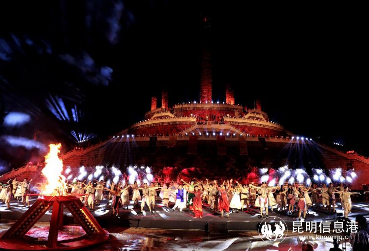 昆明信息港訊 記者楊雁 火火楚雄,星火璀璨。2023年8月10日晚,中國·楚雄2023年彝族火把節(jié)祭火大典在太陽歷文化園舉行。半小時的焰火燃放照亮了夜空;千架無人機編隊表演,璀璨奪目;彝家兒女穿著節(jié)日盛裝,和來自四面八方的游客圍著熊熊篝火,跳起歡快的左腳舞,大家共同在火把節(jié)感受火之律動,體味火之激情,領(lǐng)略火之神韻。