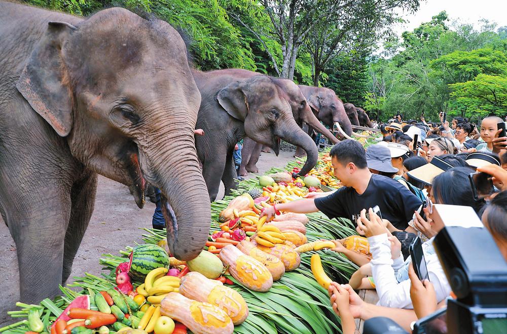 3噸多的各種水果和玉米等呈一字形堆放,隨著一聲哨響,16頭亞洲象井然有序地享用起節(jié)日大餐;游客紛紛上前給大象喂食、合影留念,現(xiàn)場(chǎng)一派溫馨和諧景象。
