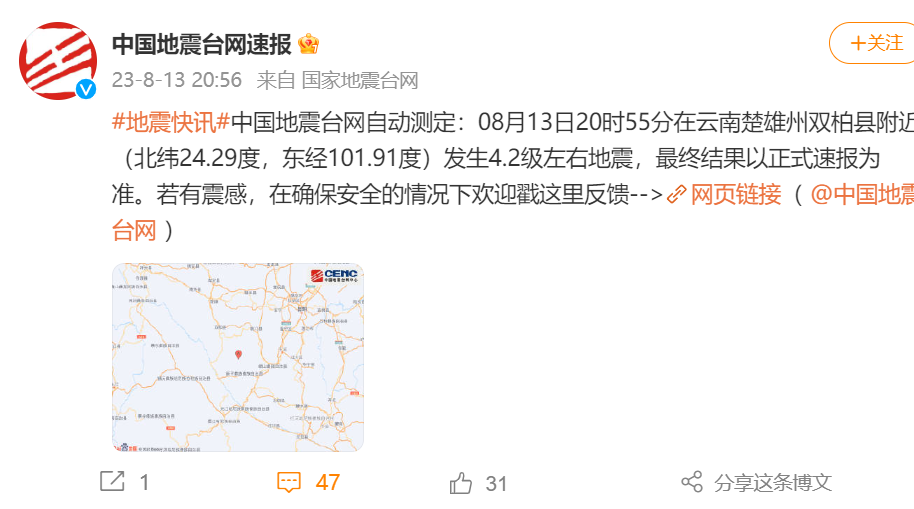 中國地震臺網(wǎng)自動測定:08月13日20時(shí)55分在云南楚雄州雙柏縣附近(北緯24.29度,東經(jīng)101.91度)發(fā)生4.2級左右地震,最終結(jié)果以正式速報(bào)為準(zhǔn)。
