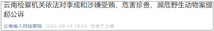 近日,麗江市古城區(qū)政協(xié)原副主席、二級調(diào)研員(正處級)李成和涉嫌受賄罪、危害珍貴、瀕危野生動物罪一案,分別由麗江市監(jiān)察委員會調(diào)查終結(jié)、麗江市公安局偵查終結(jié),移送檢察機(jī)關(guān)審查起訴。經(jīng)麗江市人民檢察院指定管轄,由寧蒗彝族自治縣人民檢察院依法向?qū)庉跻妥遄灾慰h人民法院提起公訴。