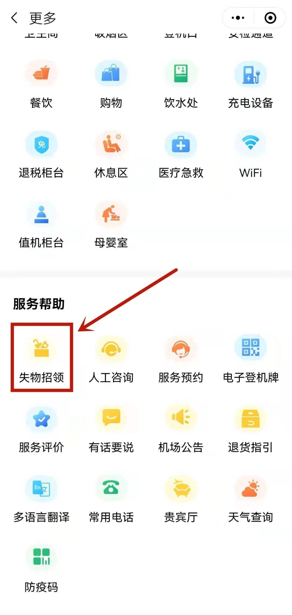 在小程序首頁點擊“更多”,進入找到“服務幫助”→“失物招領(lǐng)”,即可進入失物招領(lǐng)界面。