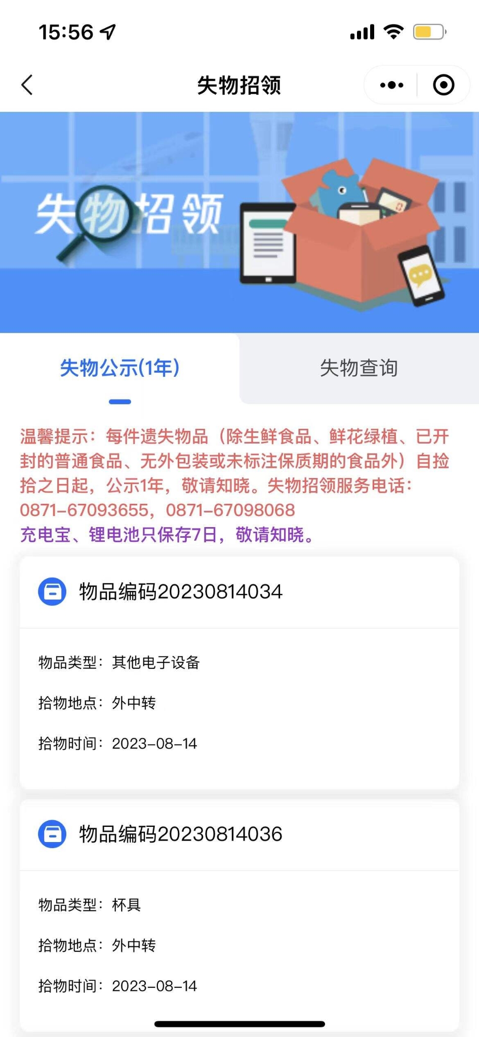 打開“昆明機場”小程序,就可以查詢到失物招領(lǐng)的信息哦,如果有您的物品,到相應地點認領(lǐng)即可!