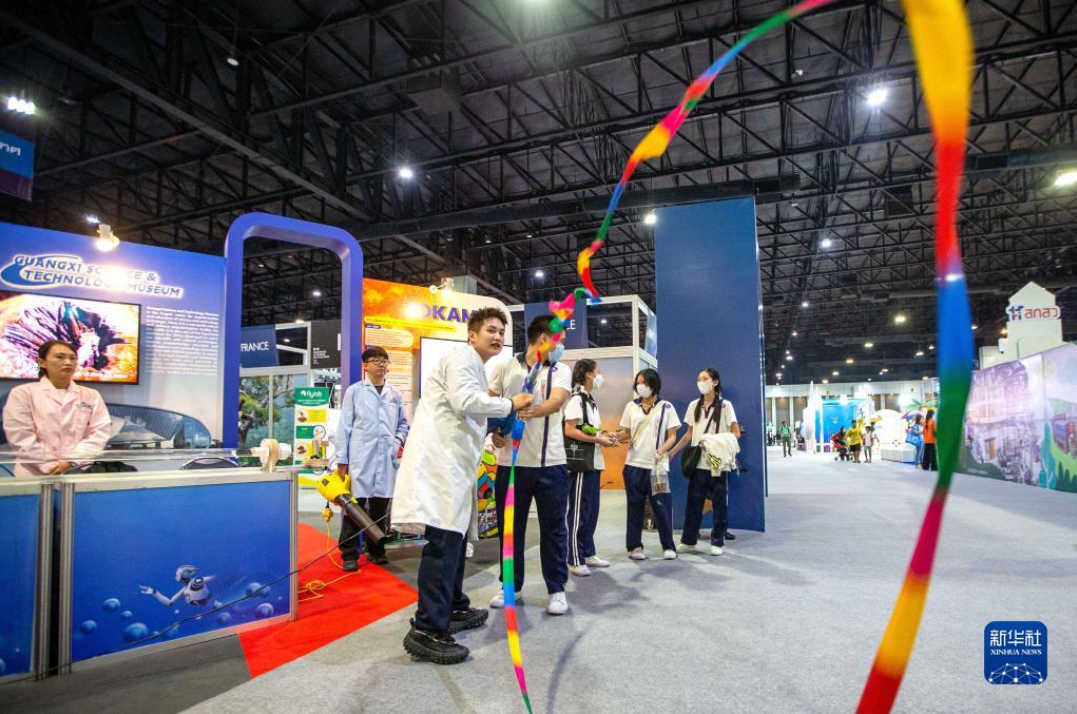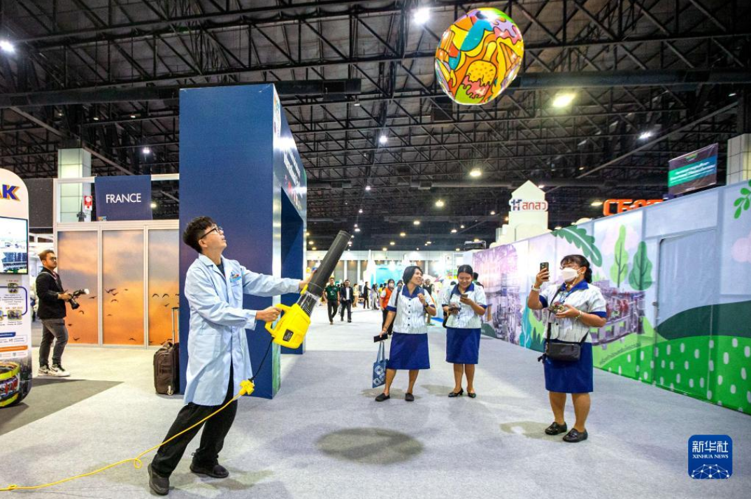 8月11日,在泰國曼谷舉辦的泰國國家科學技術(shù)展上,參觀者在中國館觀看彩帶槍實驗。