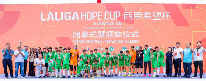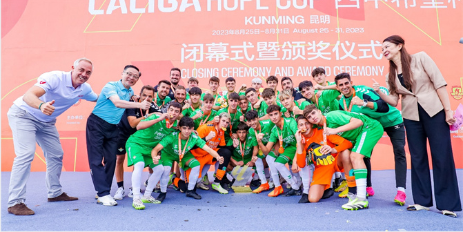 昆明信息港訊 8月30日,國際頂級青少年足球賽事——西甲希望杯(昆明)賽落下帷幕。來自中國、西班牙兩國的12支頂尖青少年梯隊,經過5天26場比賽的激烈比拼,最終,皇家貝蒂斯3-2逆轉瓦倫西亞摘得冠軍,皇家西班牙人擊敗加的斯奪得季軍。西班牙人前鋒阿龍·索里亞諾(Aaron Soriano)當選本屆賽事最佳球員,皇家貝蒂斯的哈維·馬?。↗avi Martin)被評選為最佳門將。