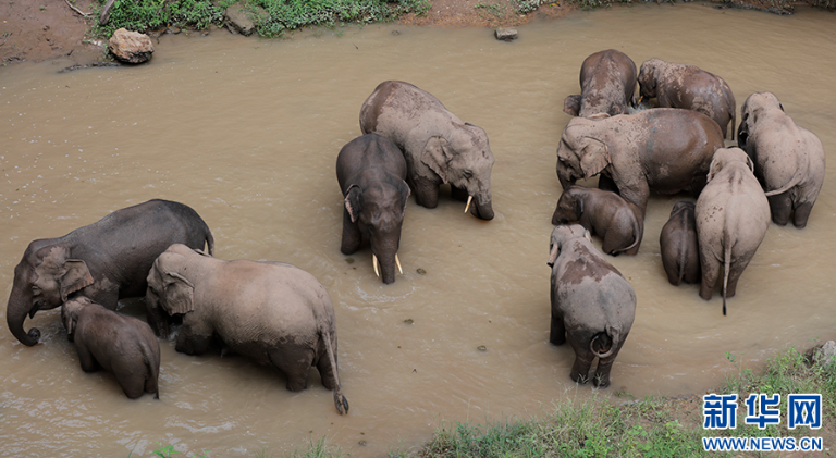 野象家族出沒,遠(yuǎn)看并不容易發(fā)現(xiàn)它們身上的毛發(fā)(7月14日攝)。新華網(wǎng) 徐華陵 攝