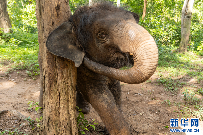 小象“龍龍”撓癢癢的方式之一就是蹭樹(7月16日攝)。新華網(wǎng) 劉云 攝