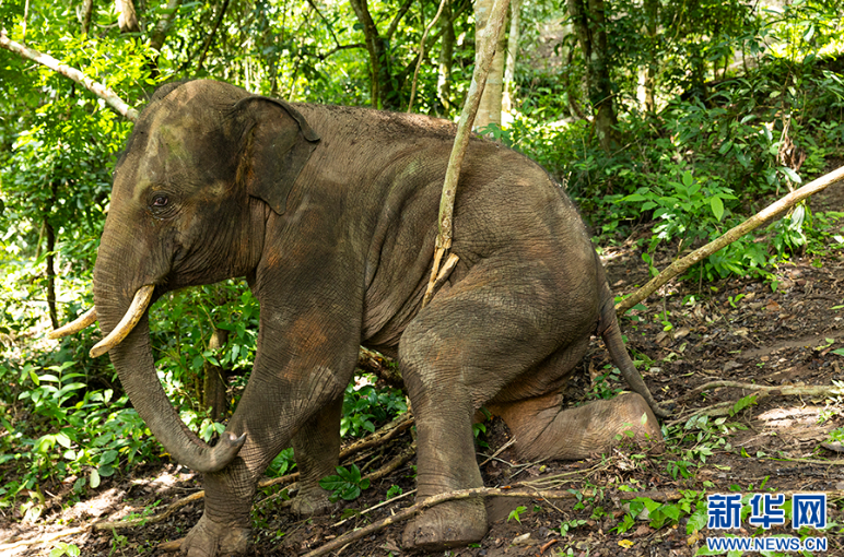在野外玩耍時(shí),救助象“小強(qiáng)”很喜歡拉扯藤蔓(7月16日攝)。新華網(wǎng) 劉云 攝