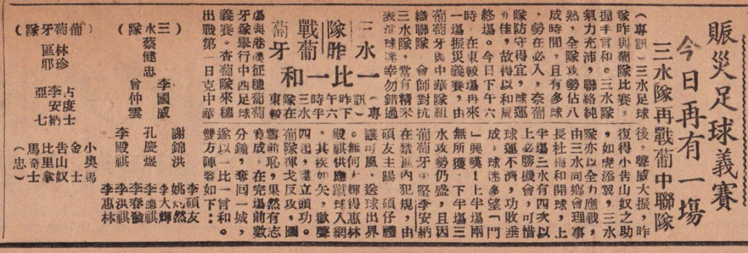 據(jù)資料記載,早在1931年,足球項目就出現(xiàn)在當時的第二屆三水縣運動會上。隨后,三水在學校開展足球運動教育。1949年,三水同鄉(xiāng)會在廣州舉辦慈善足球賽為水災(zāi)災(zāi)民籌款,邀請了葡萄牙的足球隊與三水的足球隊同場競技,并打成1:1的成績。