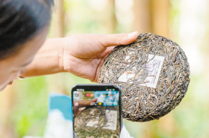 一名傣族姑娘在景邁山大平掌古茶林中直播推介自家普洱茶餅。 新華社