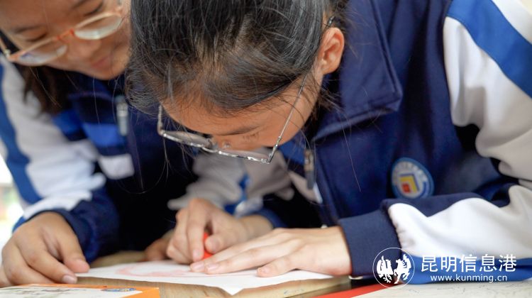 “昆明非遺”技藝活態(tài)展示區(qū)氣氛活躍,300多名學(xué)生有序參觀、體驗(yàn)。剪紙代表性傳承人段云麗老師、傳拓代表性傳承人張衡老師、安寧扎染代表性傳承人楊成老師、唐菓子制作技藝代表性傳承人阮智敏老師在現(xiàn)場為師生進(jìn)行技藝活態(tài)展示及互動(dòng),同學(xué)們表現(xiàn)出濃厚的興趣。