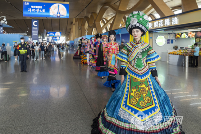 而在昆明長(zhǎng)水國(guó)際機(jī)場(chǎng),模特們圍繞機(jī)場(chǎng)航站樓B1層到達(dá)大廳和F3層出發(fā)大廳一路巡游,為現(xiàn)場(chǎng)觀眾呈現(xiàn)了一場(chǎng)精彩絕倫的非遺時(shí)尚秀。旅客們爭(zhēng)相與模特互動(dòng)、拍照,現(xiàn)場(chǎng)掀起了濃濃的“最炫民族風(fēng)”。