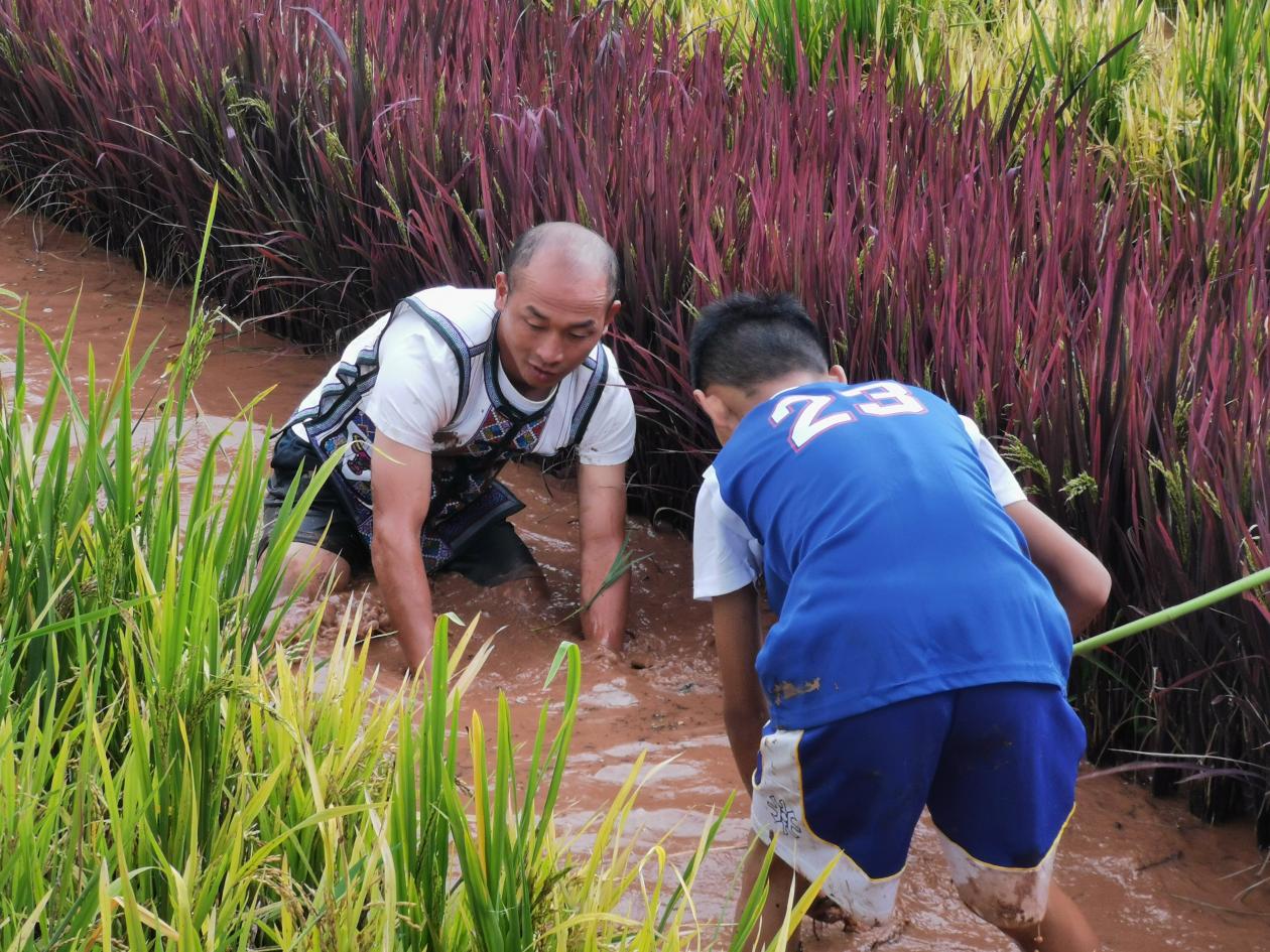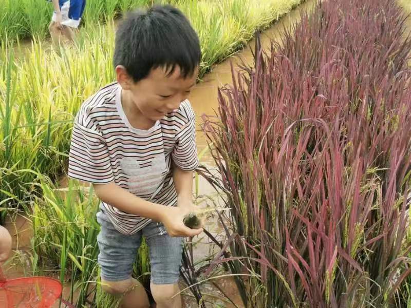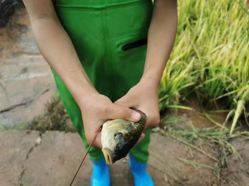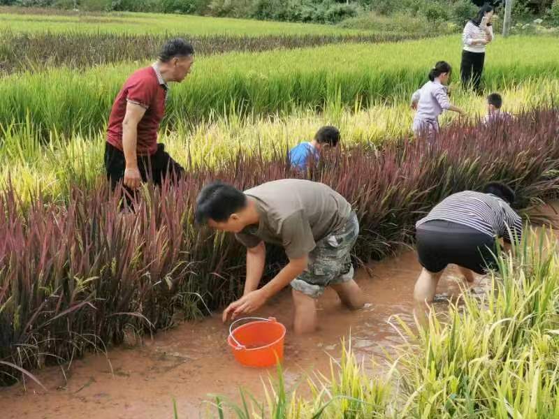作為當(dāng)天活動的重頭戲,稻田摸魚“野”味十足,受到游客熱烈歡迎。大家置身田間嬉戲,化身“摸魚能手”,徒手摸魚,解鎖開盲盒的驚喜。魚兒在腿間自由穿梭,軟軟的泥土和金燦燦的稻田間,充滿了爽朗的笑聲。人們與魚兒在稻田里“ju你追我趕”,摸到的稻花魚還可以帶回家。一場摸魚狂歡,喚起了大人們兒時的記憶,也給孩子們感受到了親近自然的童年樂趣。