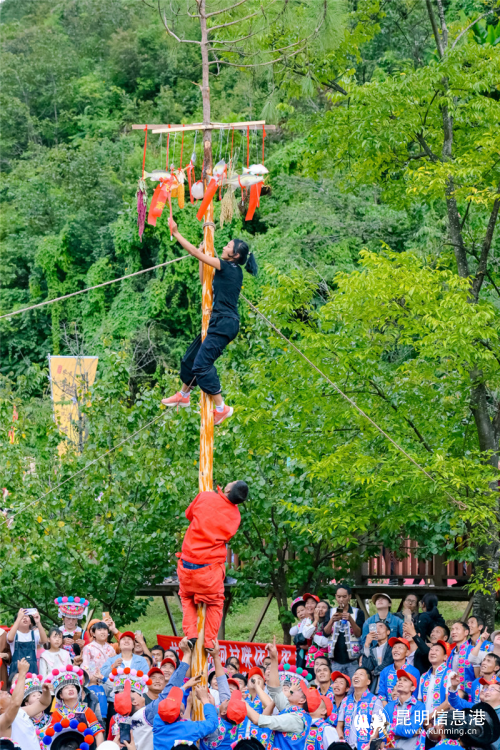 爬油桿是彝族源于遠(yuǎn)古的習(xí)俗。在山林里精挑細(xì)選,砍來(lái)一棵七八米高的筆直松樹(shù),修去權(quán)枝,刮去樹(shù)皮,用水洗凈,再用豬油、香油又抹又擦。僅余樹(shù)稍枝葉的松桿光溜溜地豎于廣場(chǎng)中央,10多支隊(duì)伍輪番上爬,比誰(shuí)能耗時(shí)最短地摘下信物。每支隊(duì)伍五人上陣,壯漢托底,身手敏捷的負(fù)責(zé)爬桿摘信物。無(wú)比絲滑的樹(shù)桿抱住都難,遑論還要爬到樹(shù)梢。這時(shí),居中的工具人承擔(dān)起酸爽的中流砥柱任務(wù),被大腳丫壓肩、踢臉、踩頭,仍抱定滑桿不放松。千奇百怪的造型逗得場(chǎng)內(nèi)笑聲、尖叫聲、加油叫好聲此起彼伏。在一眾豪杰中,一個(gè)彝家妹子幾個(gè)騰挪就到了桿頂,一把扯下信物。巾幗不讓須眉的英姿贏得場(chǎng)內(nèi)如雷掌聲。