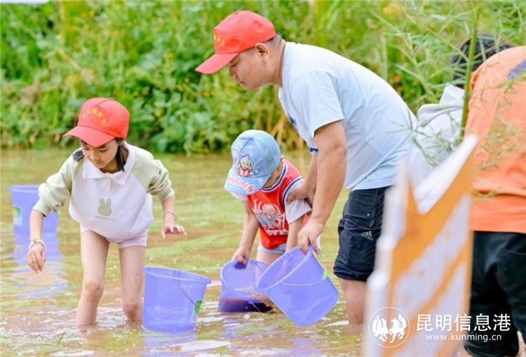 稻田里谷穗沉沉,稻香隱隱,等待摸魚(yú)的人戴著紅帽、挽高褲腳、拎著小桶爭(zhēng)先恐后地跳進(jìn)水田。吃著稻花安樂(lè)長(zhǎng)大的魚(yú)突見(jiàn)這么多人有些懵,全然不知危險(xiǎn)臨近。摸魚(yú)的好手一捉一個(gè)準(zhǔn),小娃娃們高興得在田里撲來(lái)?yè)淙?,魚(yú)是沒(méi)捉到,“泥猴”弄出不少。整整一天,摸魚(yú)的人一撥又一撥,豐收的喜悅?cè)鰸M田間。