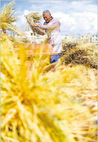 秋日驕陽下,晉寧區(qū)晉城街道沙堤村委會余家溝村田里稻香正濃,20余名村民“撿”起了手藝,打谷子、將稻草熟練捆扎堆垛,忙得熱火朝天。