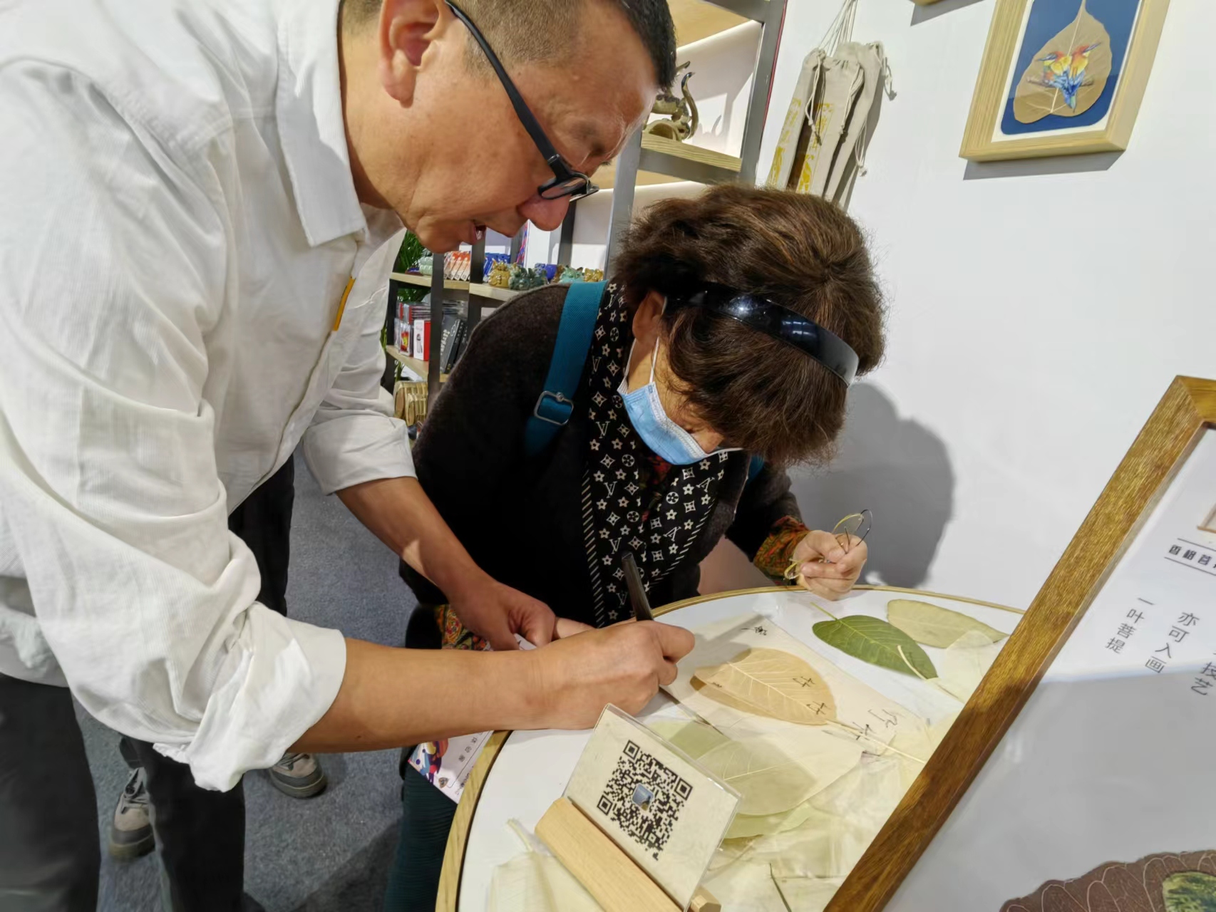 除了唐菓子制作之外,其余的非遺技藝及創(chuàng)意類手工項目展臺前,都圍滿了市民,大家或是詢問相關(guān)介紹,或是排隊等待制作,無不對這個非遺免費體驗展廳興趣滿滿,意猶未盡。其中,一位了解了菩提葉畫制作過程并在葉片上書寫了一個“竹”字的昆明市民直言:“雖然我年紀大了,但很愿意學習新東西、新事物,今天通過這位老師的介紹和指導,我學到了很多,我相信這項技藝一定能走向全國,走向世界?!?/p>
