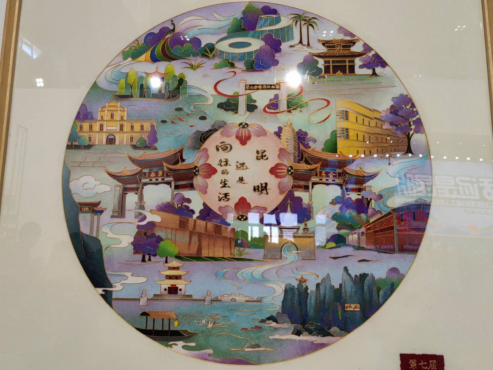 非遺項目掐絲琺瑯彩畫市級代表性傳承人鄧璧玲創(chuàng)作的“向往的生活還是昆明”彩畫