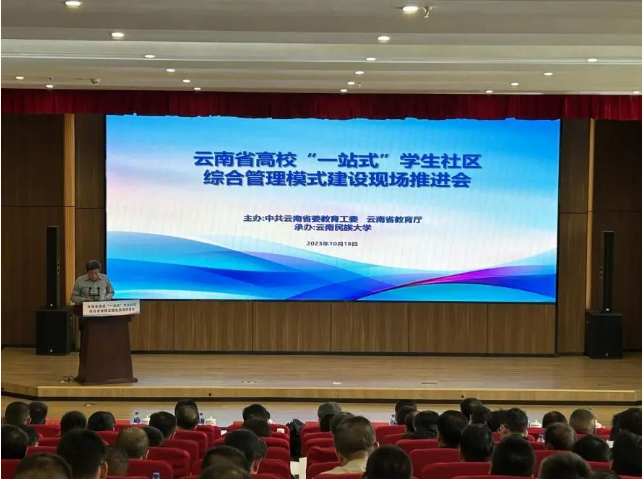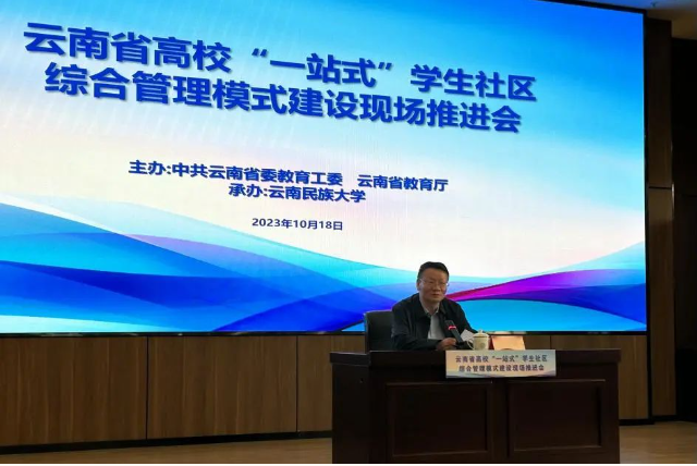 10月18日,2023年云南省高?!耙徽臼健睂W(xué)生社區(qū)建設(shè)工作現(xiàn)場(chǎng)推進(jìn)會(huì)在云南民族大學(xué)召開。省委教育工委副書記陳世波出席會(huì)議,全省87所高校負(fù)責(zé)“一站式”學(xué)生社區(qū)建設(shè)工作的校領(lǐng)導(dǎo)和學(xué)工部部長(zhǎng)共180余人參會(huì)。