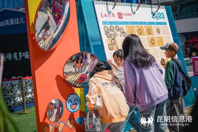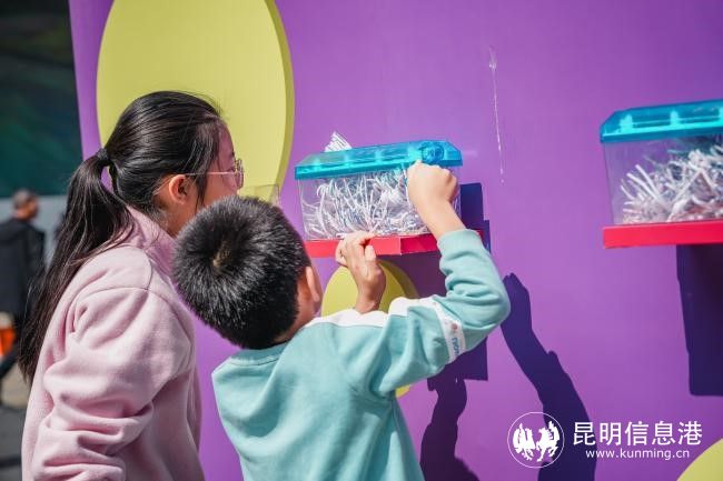 整個(gè)互動(dòng)藝術(shù)裝置區(qū)用多巴胺色為昆明市民們帶來(lái)一場(chǎng)沉浸式特別的“心靈之旅”,市民朋友們可以先在“芭比粉”的主題墻前拍照打卡,在“活力橙藍(lán)”撞色日歷墻上標(biāo)注出自己的心情日記,在“電光紫”的情緒勘探所完成MBTI情緒自測(cè),再在情緒回收站內(nèi)把壞情緒投入粉碎機(jī)一鍵清除......“克萊因藍(lán)”的情緒咖啡亭里還陳列著春城晚報(bào)的刊物、路書(shū)及周邊,市民們可以享受咖啡和書(shū)籍帶來(lái)的休閑時(shí)光。掃碼下載“開(kāi)屏新聞APP”,兌換DM單及情緒貼紙,發(fā)布相關(guān)內(nèi)容即可集贊兌換周邊禮品。