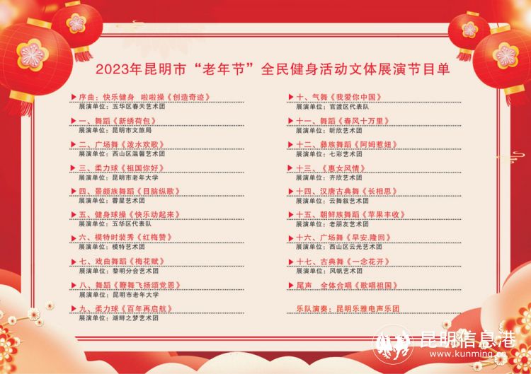 2023年昆明市“老年節(jié)”文體系列活動(dòng)由昆明市教育體育局、昆明市衛(wèi)生健康委員會(huì)(市老齡辦)主辦,昆明市老年人體育協(xié)會(huì)辦公室、昆明市老年人活動(dòng)中心承辦。