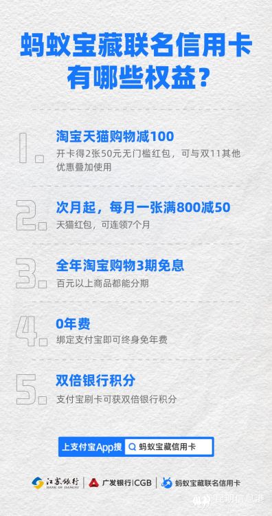 預(yù)售前夕,江蘇銀行與廣發(fā)銀行在支付寶推出聯(lián)名信用卡——螞蟻寶藏信用卡。這是銀行首次在支付寶APP嘗試發(fā)行聯(lián)名信用卡。