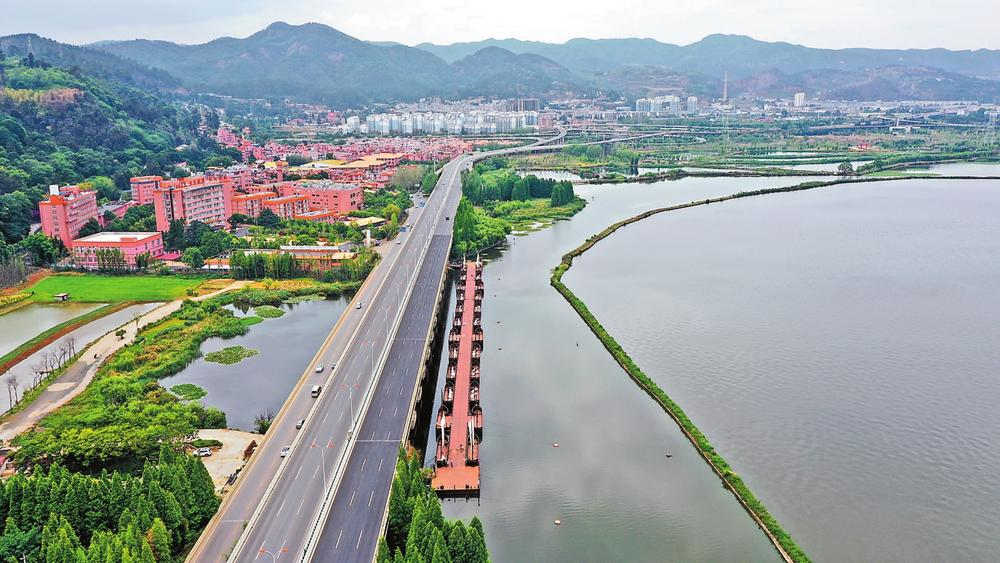 遠(yuǎn)眺滇池,一條“翡翠項(xiàng)鏈”映入眼簾。