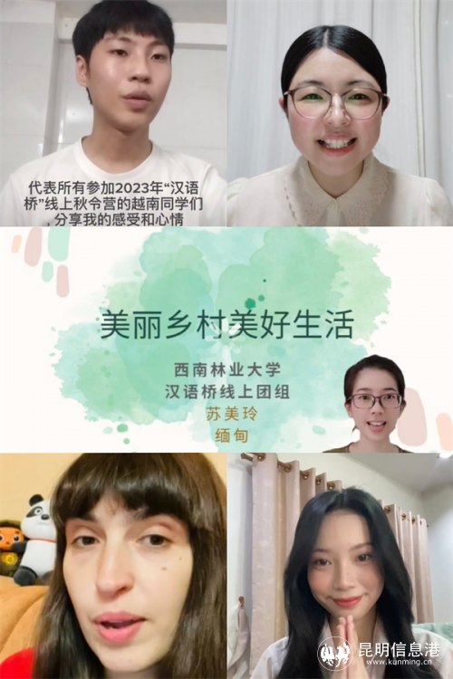 何新元對(duì)促成此次漢語(yǔ)橋線上團(tuán)組項(xiàng)目的成功舉辦的各方表示感謝,總結(jié)了此次項(xiàng)目獲得的成功,并邀請(qǐng)全球各地的漢語(yǔ)和中國(guó)文化愛好者到西南林業(yè)大學(xué)參與其他項(xiàng)目或?qū)I(yè)課程的學(xué)習(xí)。SHIMODA MAMI(日本籍)、HSU MON KYAW(緬甸籍)、TRAN CAO TRI(越南籍)、PHATCHARAPHON LUANGCHAN(泰國(guó)籍)和KORINENKO NATALIA(俄羅斯籍)5名優(yōu)秀學(xué)員代表參加此次項(xiàng)目的學(xué)生們發(fā)表了學(xué)習(xí)感言。他們均認(rèn)為參加此次項(xiàng)目學(xué)習(xí),讓他們開拓了眼界,了解了中國(guó)的發(fā)展,尤其是云南農(nóng)村發(fā)展、鄉(xiāng)村振興的經(jīng)驗(yàn)與成果,與新農(nóng)人的交流也讓他們對(duì)未來的選擇加深了思考。同時(shí),還表達(dá)了對(duì)項(xiàng)目教師、志愿者的謝意,相約來年再共聚西南林業(yè)大學(xué)“漢語(yǔ)橋”。