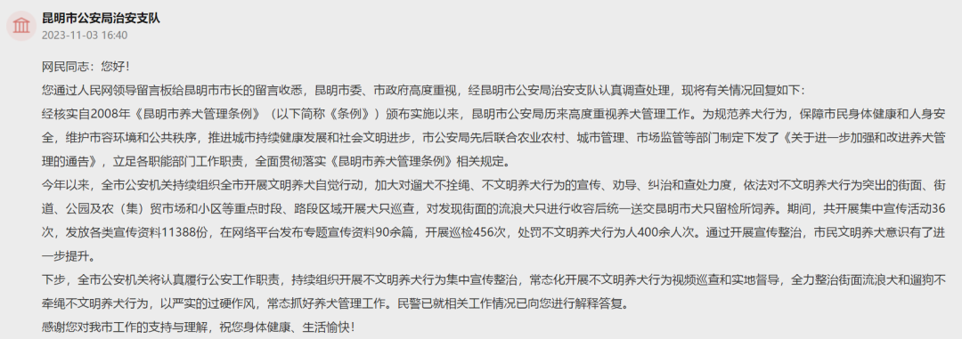 昆明市公安局治安支隊(duì)回復(fù):自2008年《昆明市養(yǎng)犬管理?xiàng)l例》頒布實(shí)施以來(lái),昆明市公安局歷來(lái)高度重視養(yǎng)犬管理工作。為規(guī)范養(yǎng)犬行為,保障市民身體健康和人身安全,維護(hù)市容環(huán)境和公共秩序,推進(jìn)城市持續(xù)健康發(fā)展和社會(huì)文明進(jìn)步,市公安局先后聯(lián)合農(nóng)業(yè)農(nóng)村、城市管理、市場(chǎng)監(jiān)管等部門(mén)制定下發(fā)了《關(guān)于進(jìn)一步加強(qiáng)和改進(jìn)養(yǎng)犬管理的通告》,立足各職能部門(mén)工作職責(zé),全面貫徹落實(shí)《昆明市養(yǎng)犬管理?xiàng)l例》相關(guān)規(guī)定。