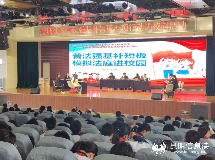 2023年11月9日,新域社區(qū)黨委聯(lián)合昆明城市學(xué)院法學(xué)院黨總支及高新一小教育集團(tuán)海源校區(qū)黨總支聯(lián)建共建,在高新一小海源校區(qū)報(bào)告廳開(kāi)展模擬法庭進(jìn)校園宣傳教育活動(dòng)。