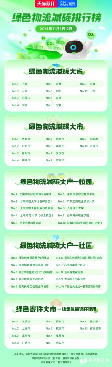 11月1日到6日期間,菜鳥驛站回收數(shù)量和綠色循環(huán)寄件數(shù)量顯示,上海市、云南省、內(nèi)蒙古自治區(qū)、北京市、吉林省、四川省、天津市、寧夏回族自治區(qū)、安徽省、山東省是這屆雙11的物流減碳大省(包含省、直轄市和自治區(qū)),其中上海市為新晉榜首。西安市、廣州市、鄭州市、南通市、成都市、南京市、武漢市、蘇州市、深圳市、濟南市則是綠色物流減碳大市。