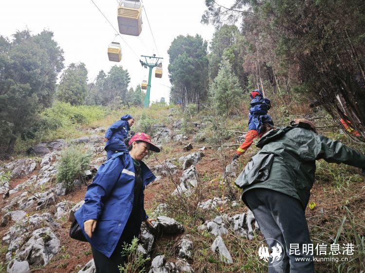 消防救援人員乘坐纜車上山,在纜車上發(fā)現(xiàn)3名被困人員在纜車通道下面。隨后消防救援人員從山頂攜帶救援裝備,徒步沿纜車通道搜尋被困人員,由于山路崎嶇,加之下雨,搜尋工作異常艱難,在搜尋過程中,消防救援人員通過電話不斷進(jìn)行溝通安撫,打消恐懼心理,穩(wěn)定被困人員情緒。