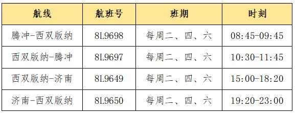 據(jù)悉,西雙版納=騰沖航線每周二、四、六執(zhí)飛,執(zhí)行機(jī)型為波音737,去程將于10:30自西雙版納起飛,11:45到達(dá)騰沖;西雙版納=濟(jì)南航線,每周二、四、六執(zhí)飛,執(zhí)行機(jī)型為空客320,去程將于15:00自西雙版納起飛,18:20到達(dá)濟(jì)南。具體航班時(shí)刻如下: