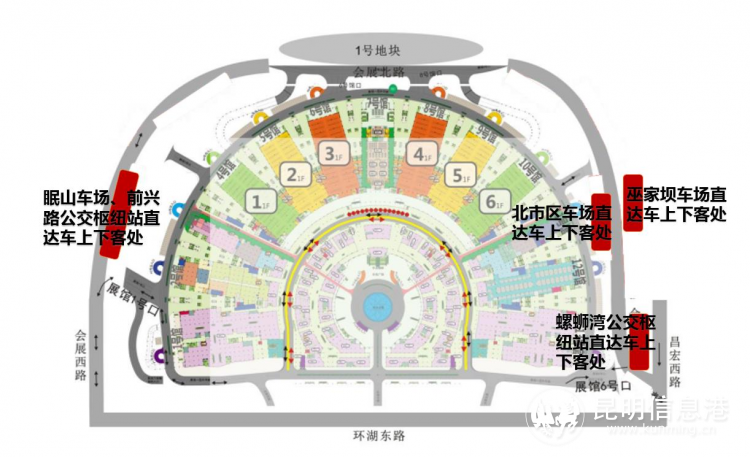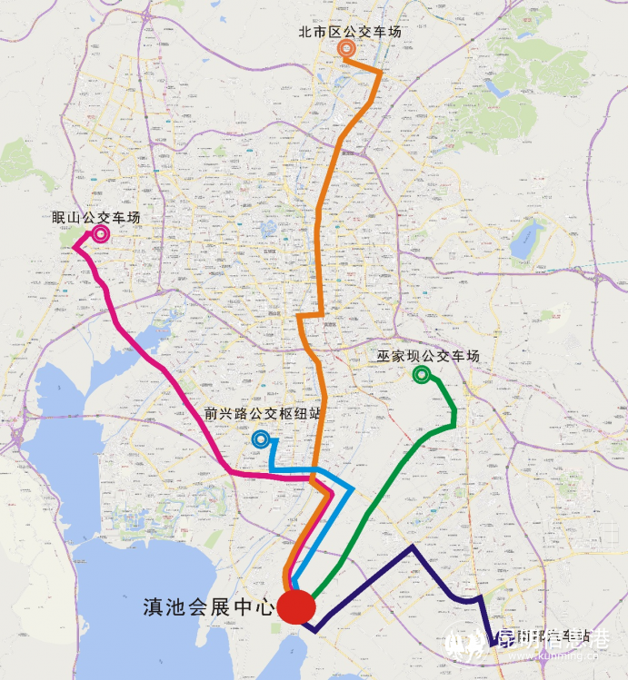 前興路公交樞紐站——滇池會展中心。營運時間:前興路公交樞紐站首班車8:30,滇池會展中心返程末班車18:40。票價5元,不使用IC卡。