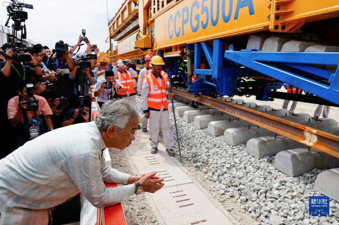 12月11日,在馬來(lái)西亞彭亨州首府關(guān)丹市,馬來(lái)西亞最高元首阿卜杜拉觀(guān)看鋪軌。新華社發(fā)(張紋綜攝)
