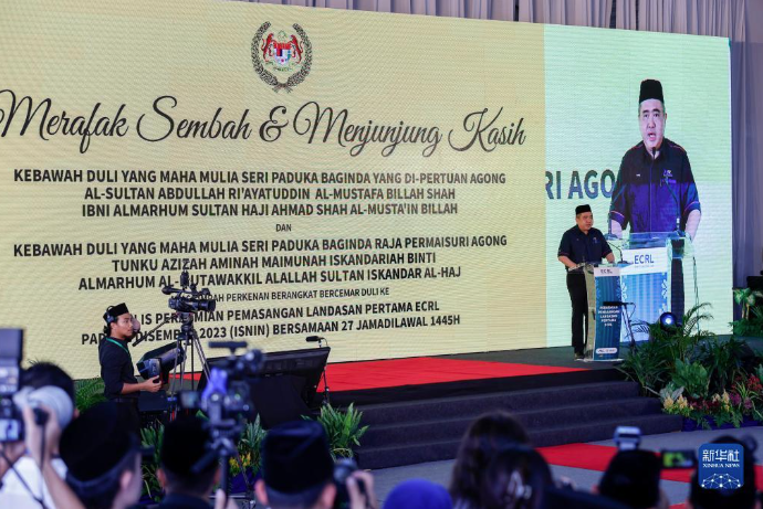 這是12月11日在馬來(lái)西亞彭亨州首府關(guān)丹市拍攝的馬來(lái)西亞?wèn)|海岸鐵路(馬東鐵)項(xiàng)目軌道工程啟動(dòng)儀式現(xiàn)場(chǎng)。新華社發(fā)(張紋綜攝)