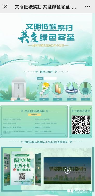 昆明信息港訊 記者尹吉 “文明低碳祭掃 共度綠色冬至”昆明市殯儀館2023年冬至祭掃網絡專題上線啦!廣大市民朋友可以登錄網絡專題開展網上祭掃。同時,為保障廣大市民身體健康和生命安全,讓大家度過一個安全、文明、環(huán)保、綠色、有序的冬至,昆明市殯儀館龍寶山華夏墓園繼續(xù)推出免費“代客祭掃”服務。