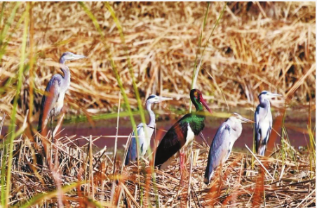 近日,在大理州洱源縣東湖濕地,4只黑鸛和4只東方白鸛一起覓食。