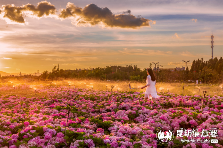 六月,斗南濕地公園,夕陽下的繡球花海賞心悅目。網(wǎng)友@寒陽/攝