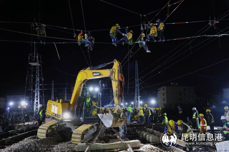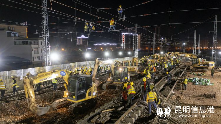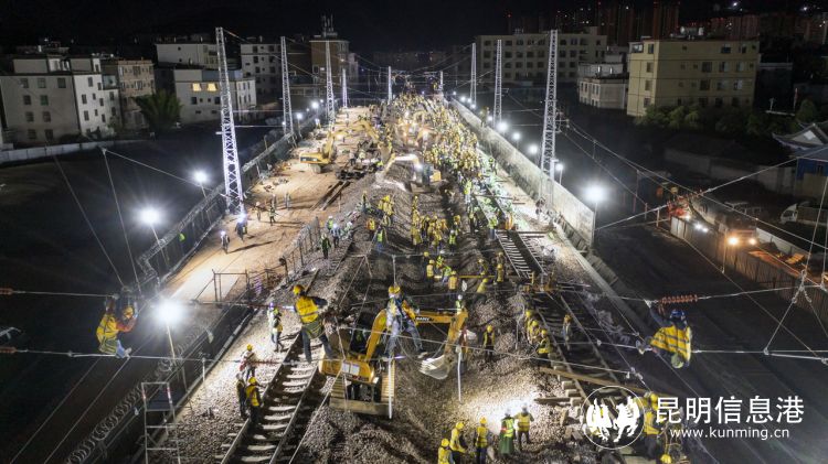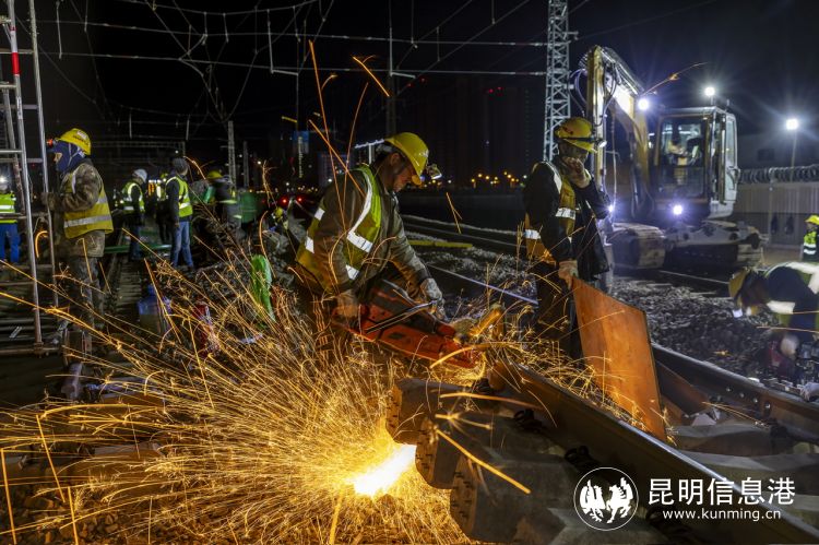12月24日23時(shí)15分,隨著最后一趟動(dòng)車緩緩駛過,調(diào)度命令下達(dá),中鐵二局450名作業(yè)人員、50多臺(tái)機(jī)械設(shè)備有序進(jìn)場(chǎng),按照既定交底的工作任務(wù)展開各項(xiàng)工作;回流線搭設(shè)、鋼軌斷開、軌排橫移、人工扒砟、撥移線路、回填道砟、線路搗固、道床整理、大機(jī)搗固及安設(shè)柵欄等每一道工序有條不紊地進(jìn)行。