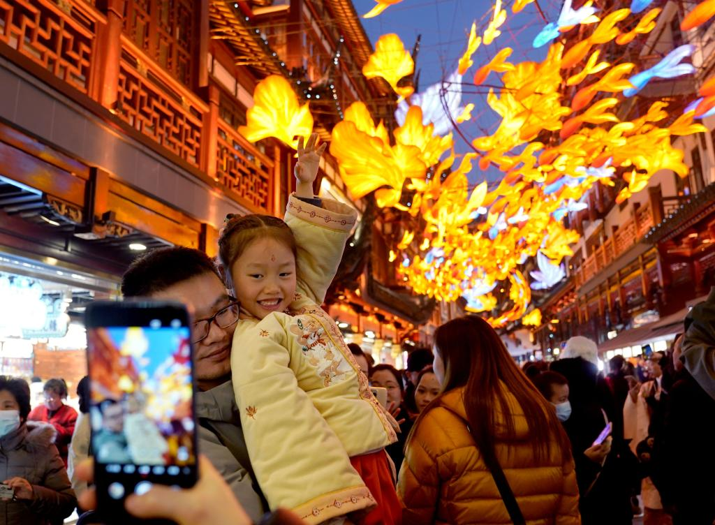 2023年12月30日,人們?cè)谏虾T@商城觀燈拍照。新華社記者 劉穎 攝