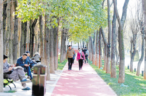 圖為船房河邊,樹木郁郁蔥蔥,市民或沿著步道散步,或在休息椅上小憩。