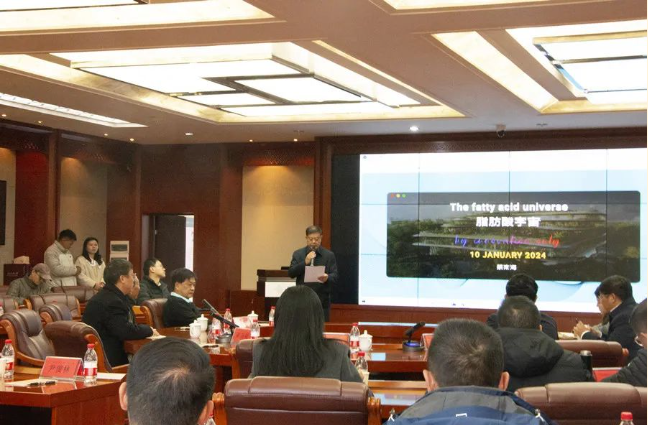 座談會后,蔡南海為云南民族大學(xué)師生作了以“脂肪酸宇宙”為題的學(xué)術(shù)報告。報告會由趙純主持,云南省農(nóng)業(yè)農(nóng)村廳、鳳慶縣科技局等有關(guān)領(lǐng)導(dǎo),云南省部分知名企業(yè)負責(zé)人,云南民族大學(xué)化學(xué)與環(huán)境學(xué)院、民族醫(yī)藥學(xué)院師生聆聽了報告。師生們紛紛表示,聽了蔡南海院士的精彩報告,視野更開闊了,對如何開展脂肪酸研究領(lǐng)域的工作有了進一步的認識,對云南民族大學(xué)在該學(xué)科領(lǐng)域的研究更有信心。
