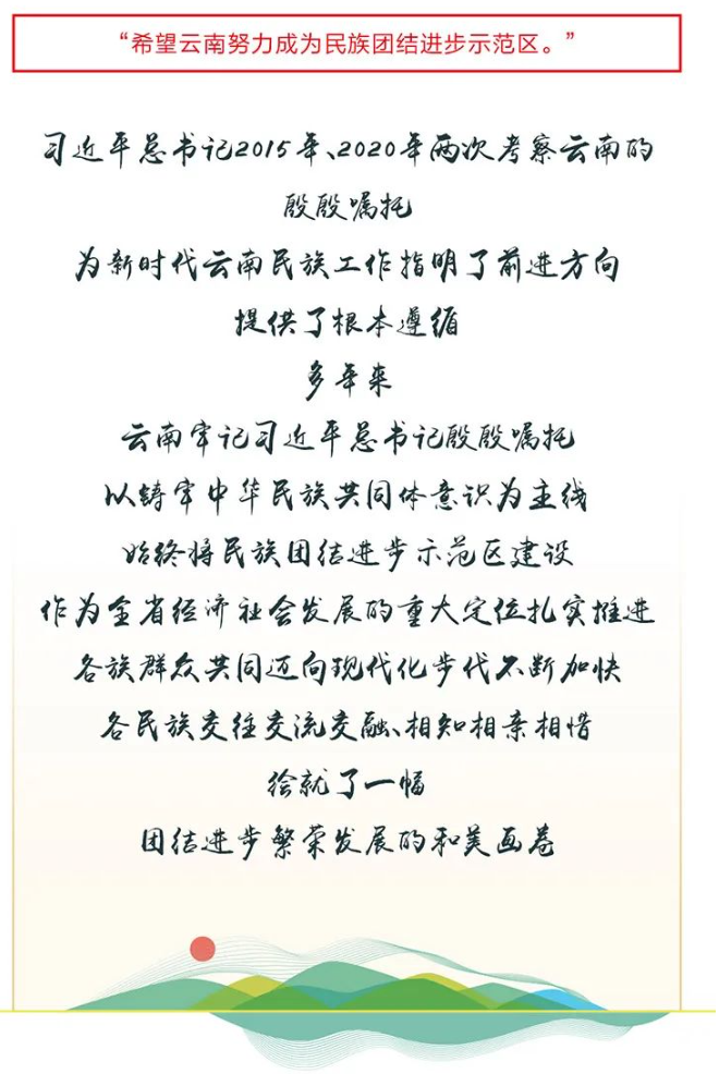 黨的十八大以來(lái),兩次考察、三次回信、兩次致賀信,習(xí)近平總書(shū)記深情牽掛彩云之南。牢記囑托,砥礪前行,云嶺兒女用行動(dòng)書(shū)寫(xiě)答卷。1月16日起,云南網(wǎng)、云南發(fā)布、“學(xué)習(xí)強(qiáng)國(guó)”云南學(xué)習(xí)平臺(tái)推出系列報(bào)道“那年總書(shū)記對(duì)我說(shuō)”,回顧省委、省政府帶領(lǐng)全省廣大干部群眾,牢記囑托,接續(xù)奮斗,把總書(shū)記交辦的事情辦好,邁出的新步伐、取得的新成就、展現(xiàn)的新氣象。全省各族人民沿著習(xí)近平總書(shū)記指引的方向闊步前進(jìn),譜寫(xiě)中國(guó)式現(xiàn)代化的云南篇章。