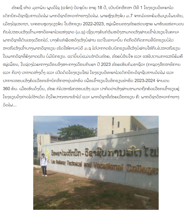我是穆卡鵬·豐威賽(Mukhaal Phunvichai, Jack),今年18歲,目前就讀于老撾鐵道職業(yè)技術(shù)學(xué)院鐵道工程系,是一名大一學(xué)生。自2022-2023學(xué)年起,從萬象賽色塔縣鵬潭中學(xué)的七年級(jí)升學(xué)考試結(jié)束后,雖然我的大部分朋友都參加了老撾國立大學(xué)的入學(xué)考試,但我卻選擇了不同的道路。當(dāng)時(shí),由于老撾國立大學(xué)部分專業(yè)招生未達(dá)標(biāo),校方為落榜考生提供了適當(dāng)?shù)恼{(diào)劑機(jī)會(huì)。但我清楚地知道,那并不是我的方向。在2023年8月至9月中旬,當(dāng)我偶然發(fā)現(xiàn)老撾教體部宣布成立鐵道職業(yè)學(xué)院,并公開選拔2023-2024學(xué)年的第一批360名學(xué)生時(shí),我毫不猶豫地報(bào)名并順利通過了考試,踏上了追尋夢(mèng)想之路。