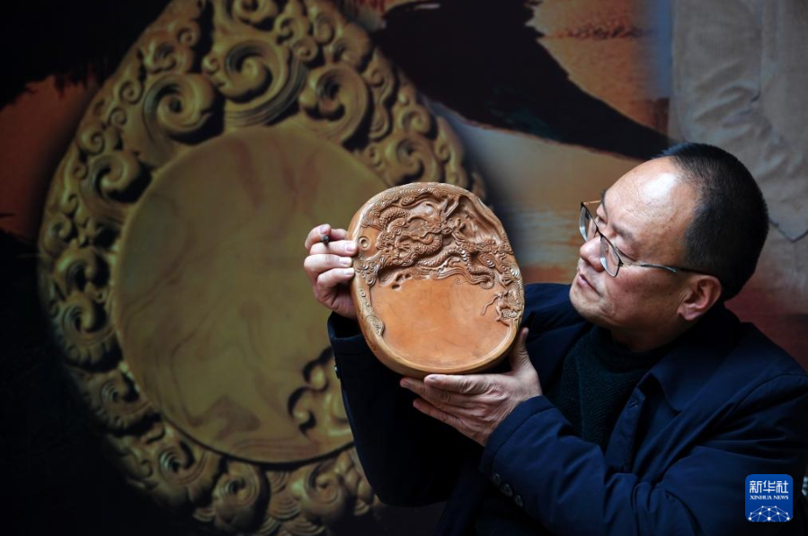 在山西省新絳縣光村絳州澄泥硯生產(chǎn)基地,藺霄麟在雕刻澄泥硯(2023年2月14日攝)。