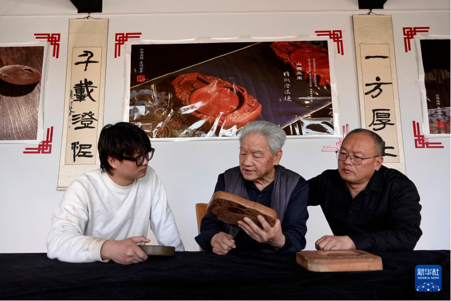 在山西省新絳縣光村絳州澄泥硯生產(chǎn)基地,藺永茂(中)和兒子藺濤(右)、孫子藺霄麟交流澄泥硯制作心得(2023年3月9日攝)。