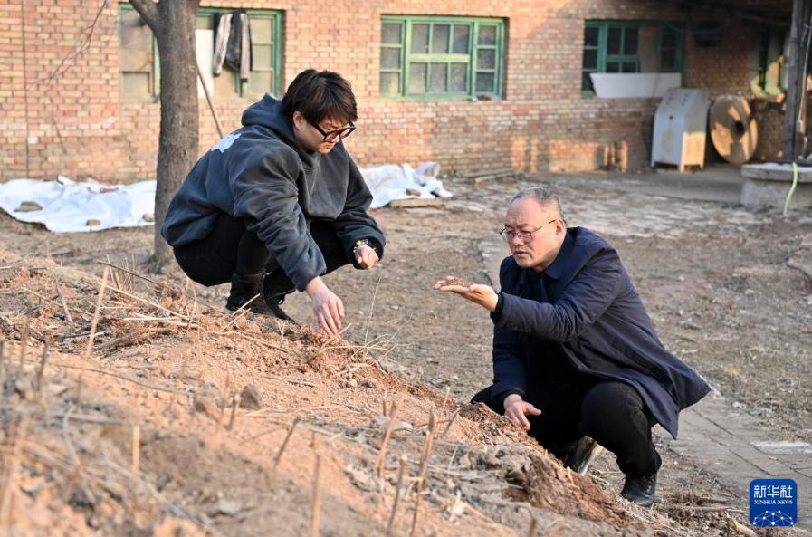 在山西省新絳縣光村絳州澄泥硯生產(chǎn)基地,藺霄麟(左)和父親藺濤交流澄泥硯選泥心得(2023年2月14日攝)。
